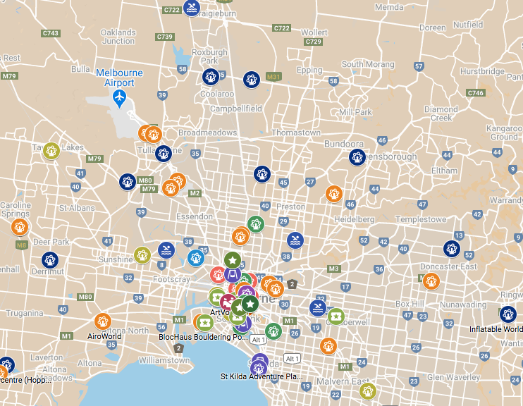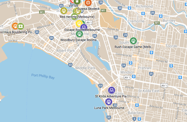 Au sud, Saint Kilda et Skinners adventure playgrounds, deux aires de jeux inimaginables en France, faites de bric et de broc et où les enfants sont invités à créer et explorer par eux même. Ensuite, Escape Room Melbourne et Woodbury (escape game dont le second propose des expériences horrifiques). Enfin, Blockaus Bouldering (escalade indoor) et GoKart (karting indoor).