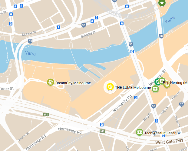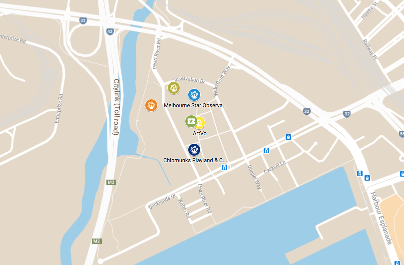 - Le Dockland District où l’on trouve la Melbourne Star (grande roue d’observation), la O’Brien Ice House (grande patinoire), ArtVo (une galerie d’art immersif) ainsi que plusieurs lieux de divertissement comme Glowgolf (mini-golf en lumière noire pour adultes), Archie Brothers Cirque Electric (Indoor Entertainment Center à thème) et une autre adresse plus centrale de Chipmunks Playland and café (aire de jeux couverte).