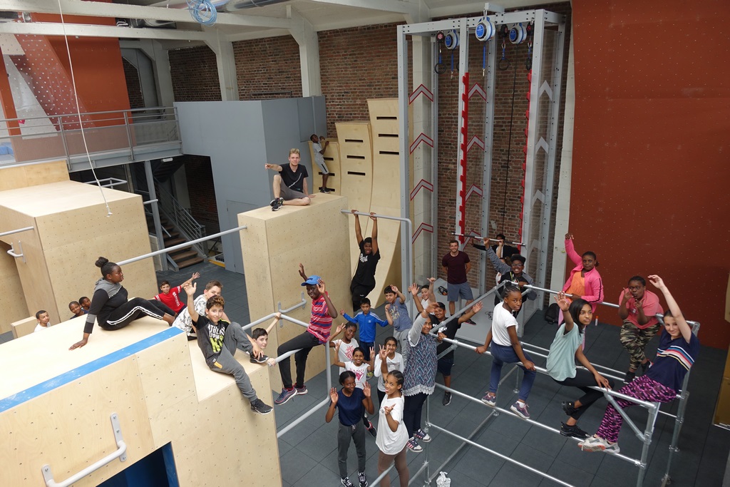 Celle de notre public expérimenté (nous avons des professionnels du Ninja Warrior et du Parkour) qui aide un public novice mais curieux à se lancer.