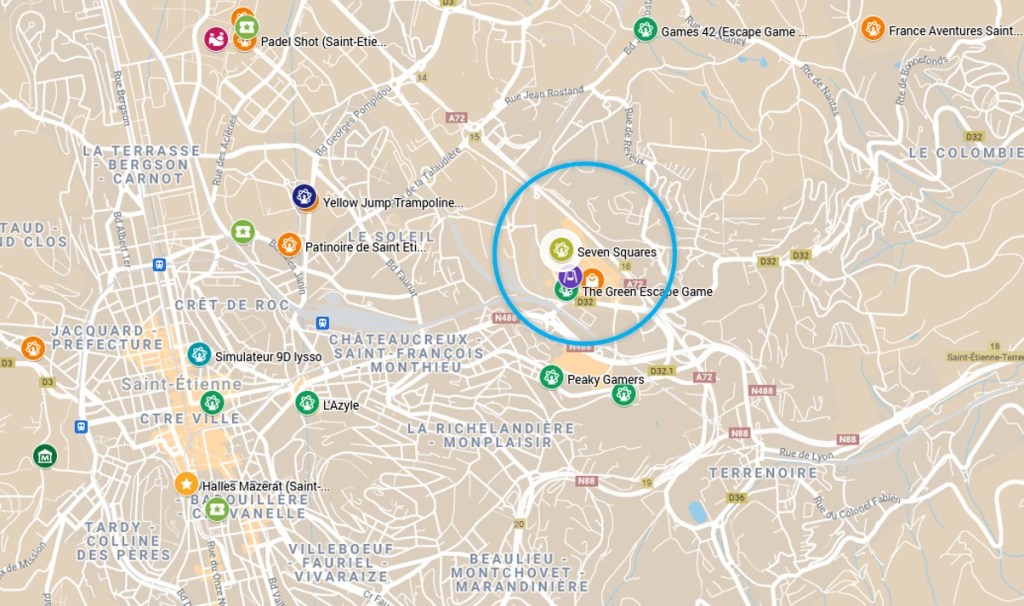 | Environnement Accessibilité | Tissu de parc d’activité en reconversion et de zone commerciale de grande importance en bordure d’autoroute (A72). Tissu d’habitat peu dense. A noter une offre de loisirs sur STEEL ou à proximité : Green Escape (par 1909, voir ce portrait), Peaky Gamers, S-Cape Game (escape games), Yellow Jump (Trampoline), Pass Partoo (kids parc) Une accessibilité locale favorisée par les transports en commun. Un rayonnement régional dépendant d’une accessibilité par véhicule particulier. |