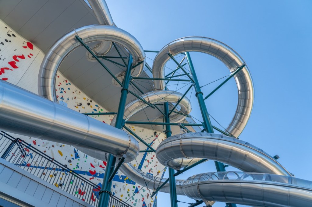 - Un concept réussi car il y a beaucoup de choix dans le type d’activité et une proposition pour une amplitude d’âge importante : de 1 ans à plus de 14 ans sans oublier les adultes. Les enfants et accompagnants peuvent aisément y passer la journée ! Le site est impressionnant avec son offre d’escalade indoor/outdoor et ses toboggans inox. Il interroge sur une éventuelle mise en lumière nocturne.